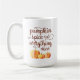 Un tazón de café con tema de calabaza adorable con una tipografía elegante con un diseño de citas que dice especias de calabaza y todo bueno con una fuente marrón con calabazas acuarelas naranjas. ¡Ideal para celebrar otoño y día de Acción de Gracias!