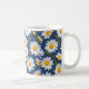 Pequeñas margaritas blancas con centros amarillos brillantes sobre un fondo azul crean una taza simple y dulce. Personaliza tu nombre con un óvalo amarillo.