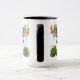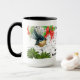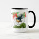 Una taza de café con un fondo de mapa de la Isla Norte, nuestro ave nativa Fantail y flor de pico de Kaka en ella.