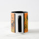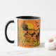 Taza clásica con una escena de Halloween del vintage: campo de maíz, esqueleto, calabazas, gatos negros, y casa encantada.