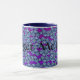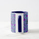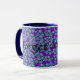 El fondo púrpura con las flores azules de la nomeolvides y el subtítulo "me olvidan no" en una taza de café con la manija azul