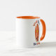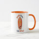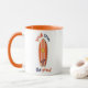 Una taza de café con una tabla de surf naranja, con la frase "Descansa de la rutina" centrada alrededor de la imagen. El diseño sugiere una escapada despreocupada y aventurera de los estrés diarios.