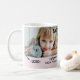 La taza de café del día de su padre, dulce y encantadora, incluye dos fotografías de personalizable de su hija, una de color real en un lado, y una de recién nacidos en blanco y negro en el otro lado (el efecto blanco y negro se aplica automáticamente). Debajo de las fotos, los mensajes de texto de personalizable en fuentes grises oscuras leen Feliz día del padre de tu mayor fan, con el nombre del niño, el año actual, y su año de nacimiento en un fondo rosa claro.