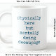 Presentando la extravagante cita, "físicamente aquí pero mentalmente haciendo la desconexión" en un tipo de letra vintage estilo máquina de escribir, esta taza es ideal para los artesanos que siempre sueñan con su próximo papel y obra maestra de pegamento. La redacción aparece en ambos lados para una visibilidad total y es totalmente editable, por lo que puede cambiar la redacción para que se ajuste a su personalidad, humor o obsesión por la manipulación. Donde quiera que estés tomando té, esta taza es un regalo cuidadoso o un regalo personal para cualquiera adicto a la desconexión.