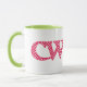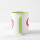 Una taza del campanero de la diversión con un labio y una manija verdes y la palabra "cwtch" Galés, significando la "abrazo" o el "abrazo", en una escritura céltica, llenaron de un modelo de lunar rojo y blanco brillante.