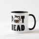 Taza de café divertida que dice: Cabeza del pote. El diseño del retruécano del pothead es una palabra doble-entendre que lleva nos a creer que el dueño de la taza es un amante recreativo de las drogas, o a un amante del café. O ambos…