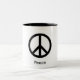 La taza de café con una imagen de un signo de la paz y dice paz bajo signo de la paz