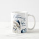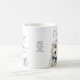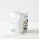 Hermosa taza navideña con exquisito acuarela blanca festividad Westie (también llamada Poodle y Terrier) usando sombrero Santa y adorno en collar jugando con adornos a su lado. Frase "Deseos de Navidades y Besos de Amor de Cachorro" en azul, moderna escritura a mano y tipografía en bloques. El cachorro blanco y el resto de elementos decorativos en tonos azul, blanco y plateado. Capacidad para agregar un mensaje o nombre en el medio o borrar. ¡Un gran regalo de vacaciones para todos los amantes del perro!