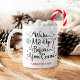 Tome una taza caliente de su chocolate caliente favorito en esta linda taza personalizada. Estas tazas incluyen la graciosa frase "Despiértame antes de que cocine" y espacio para tu nombre personalizado u otro texto. El diseño también incluye una caña de caramelo, un pequeño malvavisco, copos de nieve, estrellas y pequeños árboles. La obra de arte se repite en la parte trasera. Utilice la plantilla fácil de personalizar.