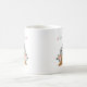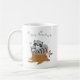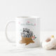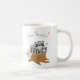 Dibujo dulce de una madre y un bebé mapache en un tocón de árbol con flores y mariposas rosadas.
