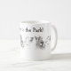 Un original y muy lindo dibujo en blanco y negro de dos amigos caninos con el texto "¡Vamos al parque!" adorna este divertido tazón de café.