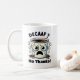Una taza de café se ve horrorizada con los ojos anchos. La taza está sudando nerviosamente, con pequeñas habas de café huyendo de miedo. Texto: "¿Decaf? ¡No gracias!"