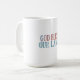 colorida taza con la frase "Dios bendiga nuestra tierra" impresa en una letra juguetona y personalizado. La taza está decorada con símbolos patrióticos, como estrellas y rayas.