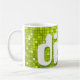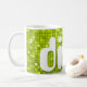 Mug con un divertido y divertido estilo de "espejo disco" estampado en tonos verde y blanco limón, y texto de estilo retro. Se puede usar como fondo para tu propio texto, imágenes e ideas. Tenga en cuenta que esta es una imagen de arte digital impresa, no brilla ni contiene espejos o purpurinas reales.