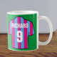 Regalo para un hincha de fútbol. Mug con camisetas de fútbol en blanco y azul. Personaliza con tu elección de nombre y número.