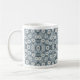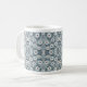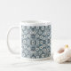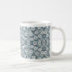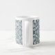 Esta taza de café tiene un fondo gris con diseños florales blancos.