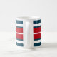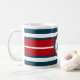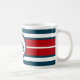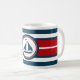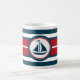 Diseño náutico con decoración de velero en forma redonda sobre fondo rayado rojo, azul y blanco