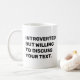 Resalta tu personalidad con este gracioso café de personalizable que muestra la ingeniosa frase "Introvertido pero dispuesto a discutir" seguida de tu propio texto. Ya se trate de libros, café, viajes o cualquier interés peculiar, se puede elegir el tema que te define. Puede agregar su propio nombre para un toque personal. Esta taza de café humorística es un gran regalo para los introvertidos con sentido del humor. Utilice la herramienta de diseño para cambiar el color del texto si lo desea, y seleccione el tamaño y el estilo de la taza en el menú.