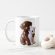 A heart-melting 3D figurine scene showing a glossy chocolate-brown puppy hugging a bright white kitten. Big sparkling eyes, soft smiles, and rounded shapes create a cute, gentle mood. Polished highlights and smooth plastic-like texture pop under clean studio lighting on a minimal white backdrop—pure pet friendship and tenderness.