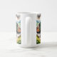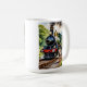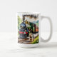 A nostalgic scene of a dog greeting the arrival of a green steam train.