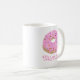 Con rociadores multicolores sobre un donut rosado, esta taza está disponible para su personalización añadiendo un nombre. El color del tipo de letra es rosado. El arte y el nombre están en la parte delantera y trasera de la taza.