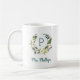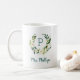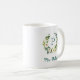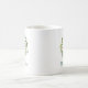 Personalizado monogramado taza de café personalizada con su nombre inicial y otro texto. Esta sencilla casa de campo presenta un diseño inspirado en una cortina de agua de vegetación y flores blancas sobre un fondo blanco. Añada su letra de monograma en el marco botánico y nombre en un tipo de letra de guión moderno. Utilice las herramientas de diseño para elegir cualquier color de fondo, cambiar los tipos de letra y los colores del texto o añadir sus propias fotos para crear un diseño de una taza amable. Un regalo perfecto para profesores o recién casados.