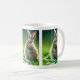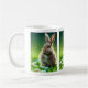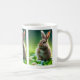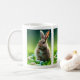 Esta taza muestra a un conejita dorado y blanco disfrutando del sol de la primavera mientras se sienta en la hierba con coloridos huevos de Pascua cerca de sus pies.