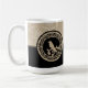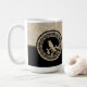 Disfrute de su café matutino con este moderno diseño de tazas con fondo de damasco crema adornado con un emblema de ave amorosa de negro ébano. El texto de personalizable le permite alterar las fuentes, cambiar los colores y tamaños del texto según desee. Personalice para usted o haga un gran regalo.