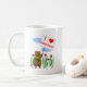 Un tazón de café con mi diseño de un pequeño castor sosteniendo un cartel que dice "Yo corazón Saskatchewan".