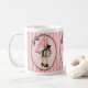 Compras elegantes de la señora con el perrito del bulldog francés en fondo rosado rayado. Pintado por el artista Maryline Cazenave.