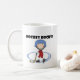El hockey oscila las camisetas, tazas, imanes, tarjetas, pegatinas, las bolsas de asas, sudaderas con capucha, y ofreciendo una figura jugador del palillo de hockey masculino con patines, un palillo de hockey, y casco y el texto que lee "rocas del hockey!".
