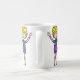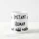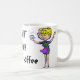 Gráfico de una señora feliz que sostiene una taza de café. El texto lee: El "ser humano inmediato apenas añade el café". ¿Usted conoce a un adicto al café? ¡Ésta es la taza ideal para ellos!