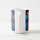 White ceramic mug with blazing neon orange and cool blue city bokeh, rain-slick reflections, full-wrap glossy urban night artwork.