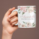 Las elegantes flores de color rosa y marfil de color rosa y marfil enmarcan la parte superior e inferior de esta encantadora taza nupcial de primavera para su chica floral. Las brotes de hojas verdes de sabio decoran en medio de las peonías florales de melocotón que rodean el nombre personalizado de la fiesta nupcial en caligrafía.