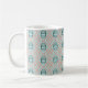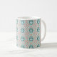 Esta taza tiene un diseño art deco de diamantes naranjas con ángulos rectos en el interior y círculos verde azulados con ovales superpuestos, todos repitiendo a través del patrón. Si te gusta el diseño pero prefieres colores diferentes, envíame un mensaje.