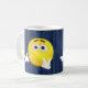 Taza de café de moda de la emoji en un fondo de madera azul. © del diseño de Nayda Liz Rivera