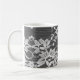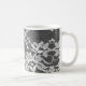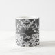 Taza De Café Encaje floral blanco sobre un fondo negro.