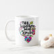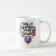 La taza de diseño de enfermería presenta objetos de efecto teñido, incluyendo un corazón con latido de corazón, estetoscopio, aguja hipodérmica, taza de café, vendas y texto negro que dice ESTE superhéroe lleva manchas.