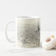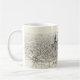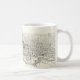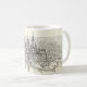 Esbozo monocromático detallado de una bulliciosa ciudad con un paisaje urbano diverso, con una estructura como un castillo en el centro, rodeada de varios edificios, un río y un puente.