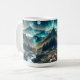 Un hermoso ilustracion de campamento aéreo de una tienda de campaña instalada junto a arroyo con un fondo montañoso y las luces boreales y luna llena en el cielo.