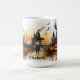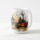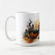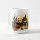 Una adorable bruja en un enorme gorra se alza entre los jack-o-lanterns mientras los murciélagos vuelan sobre esta linda y divertida taza de café de Halloween.