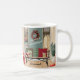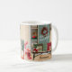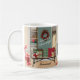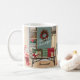 El Merry Mudroom Scene Coffee Mug cuenta con una pintoresca sala de estar decorada para las vacaciones. Está lleno de sudaderas, un gorra de vaquero, una corona y sorpresas de regalo para los Navidades.