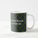 Insignia de Campbell escudo rodeada de una correa y hebilla sobre fondo tartán. Texto personalizado en ambos lados.