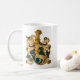 Ilustracion alemán vintage con un escudo con un dibujo de Aries en un escudo de azul y oro y un florecimiento de plumas. Gran regalo de cumpleaños para las personas nacidas en marzo o abril.