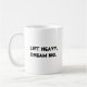 Una taza con el eslogan motivador "Levanta pesada, sueña grande". en una tipografía de texto negro negrita.