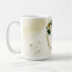 Hermosa taza de café con flores esmeraldas, marfil, blancas y doradas con hojas doradas y monograma.