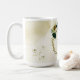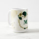 Hermosa taza de café con flores esmeraldas, marfil, blancas y doradas con hojas doradas y monograma.