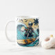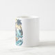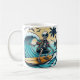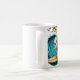 Ilustración de un esqueleto surfeando en una playa con olas, palmeras y gaviotas en una tarde de verano.