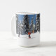 Una hermosa escena invernal de dos esquiadores en una montaña nevada que da un vistazo al paisaje. Árboles cubiertos de nieve parados altos.