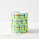 Esta taza está cubierta con un diseño moderno de mediados de siglo de estallidos atómicos en un fondo verde.